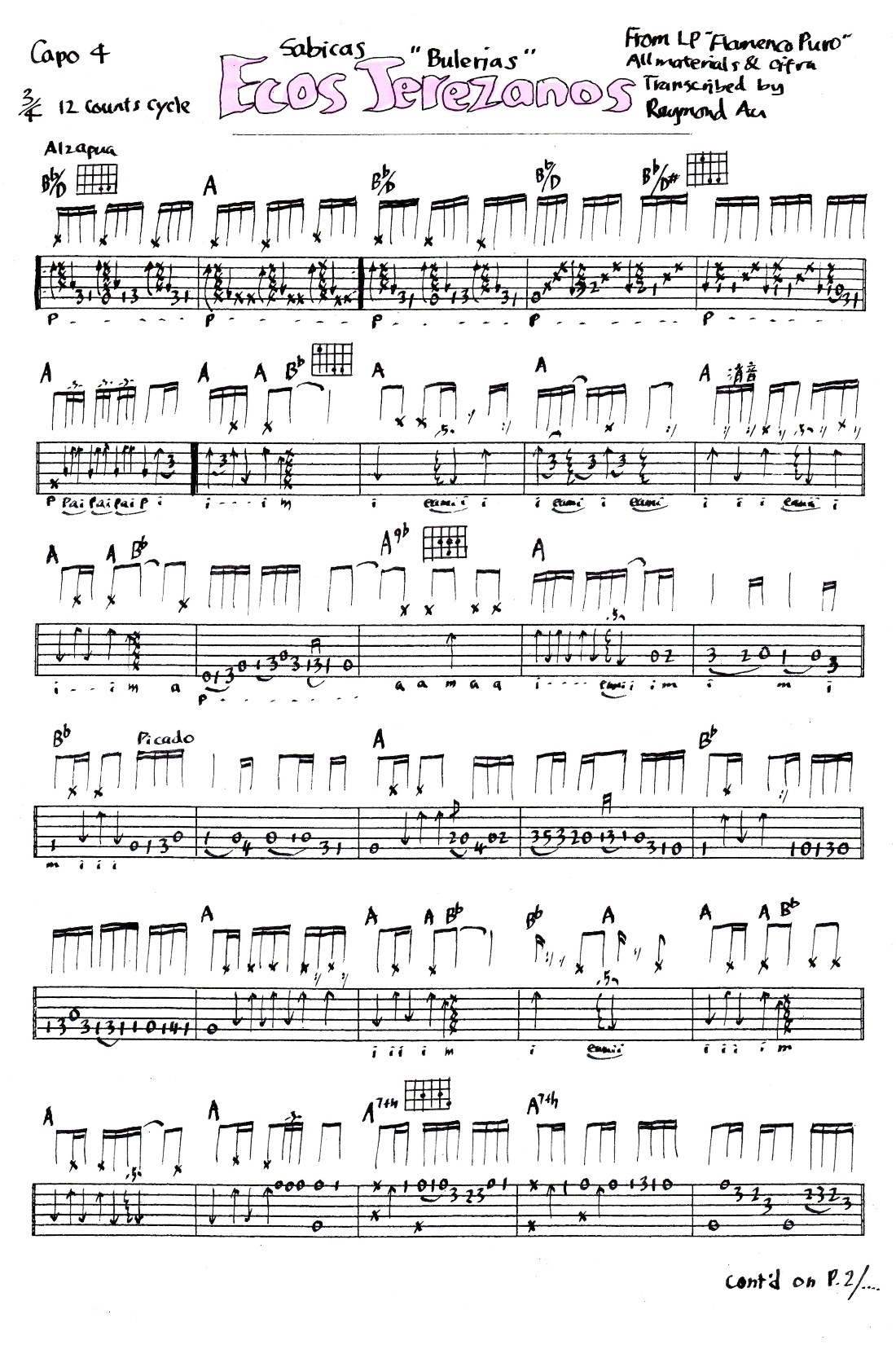 Sabicas在專輯中展現了Pulgar的連續Ligado和Alzapua技巧,速度快、音色清晰,並且節奏精準。為了讓大家更了解其音樂風格,筆者提供Ecos Jerezanos的手寫六線譜供學習參考。努力!