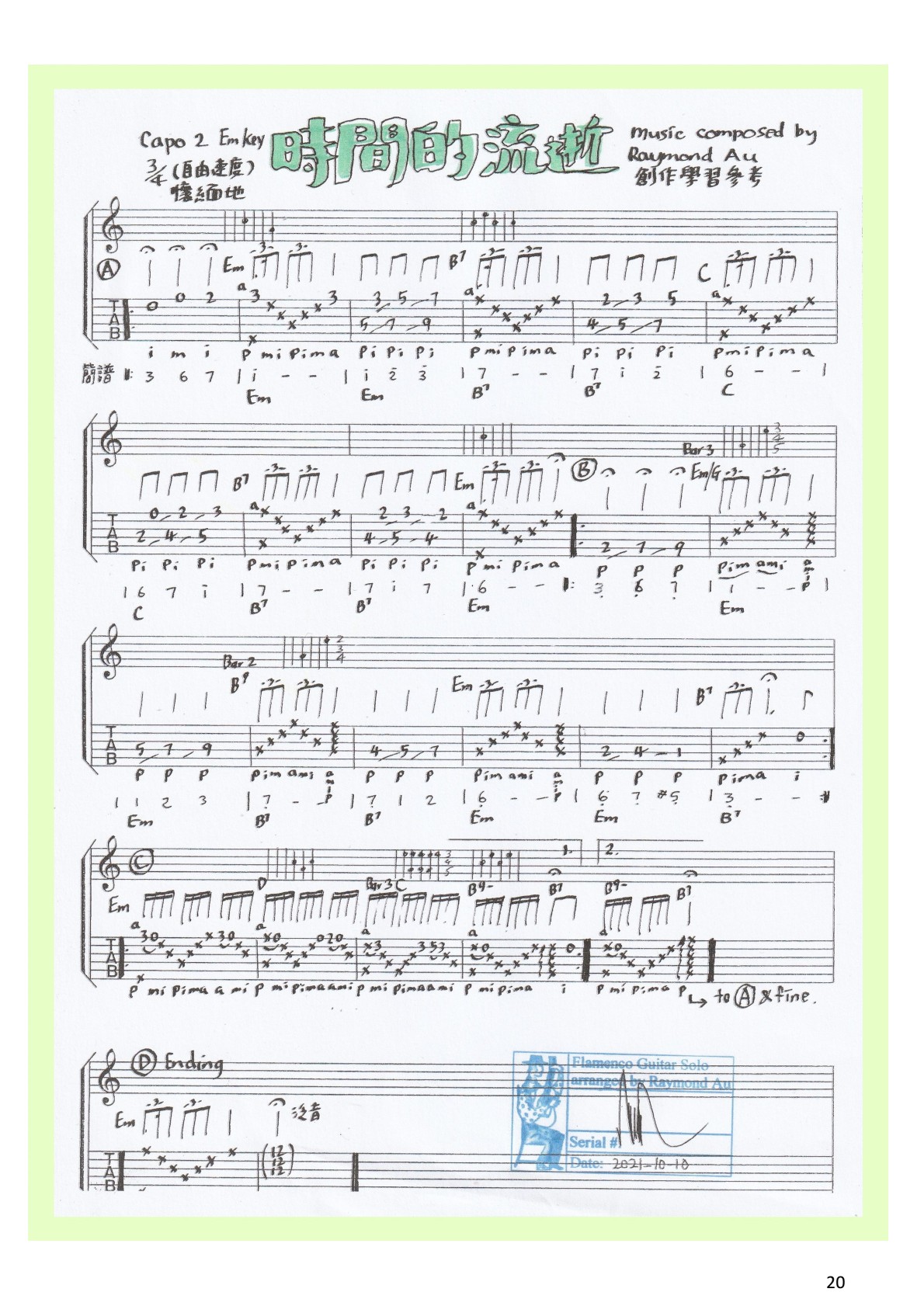 第三首是筆者的創作示範作品《時間的流逝》,以抒情的旋律展現時間推移的感受,並融合佛蘭明高結他的獨特節奏與技巧,讓有興趣學習佛蘭明高結他創作方面,提供一個參考的例子。