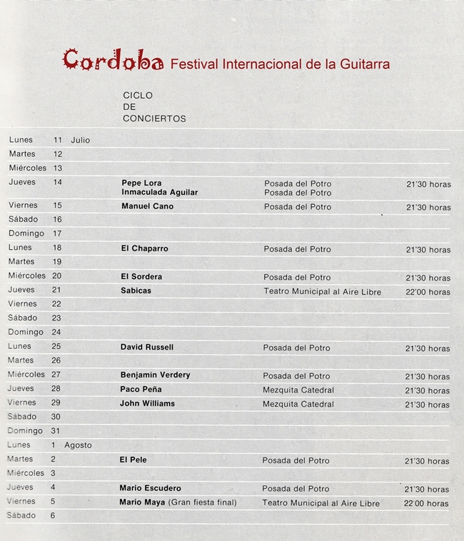 Paco Peña在1983年除了繼續在其家鄉科爾多瓦(Cordoba)舉辦「第三屆Centro Flamenco結他國際研習班」外,他還主辨了第一屆科爾多瓦國際結他藝術節(Festival Internacional de la Guitarra),目標是推廣代表西班牙的古典和佛蘭明高結他音樂為活動宗旨。