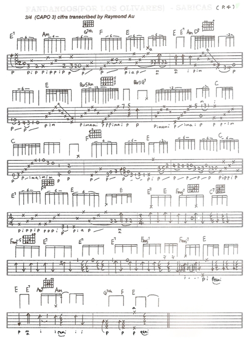 最後,送上一首取自Sabicas的著名LP唱片"Flamenco Puro"中的經典樂曲 Por Los Olivares(Fandangos) 給讀者們學習欣賞,此曲除了精湛的演奏技巧和音色處理外,Sabicas在創作和編排Falseta方面確是非常出色,值得大家用心學習。努力!