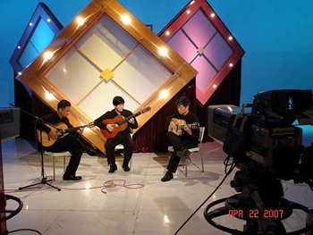 (圖片:李志雄、林貴有及莫瑞祺在TVB文化廣場表演結他三重奏)