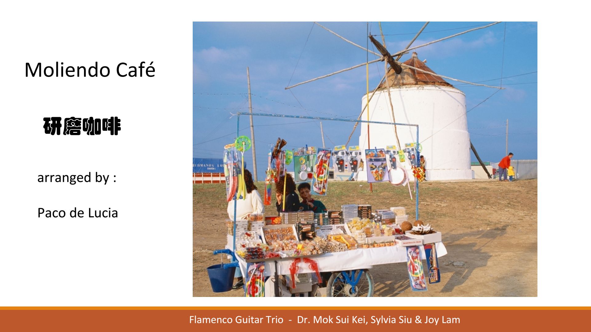 Moliendo Café 是一首非常輕快的Rumba,很有Paco De Lucia 的彈奏特色,音樂句子大部分運用了切分音 (syncopation),它是一種強調「弱拍」或非預期節奏位置的音樂技巧,它會打亂正常的強弱拍節奏,創造出節奏上的張力與趣味。Syncopation 給予我們三人在三重奏時增進默契的機會,相信以後我們彈奏三重奏時會更合拍!