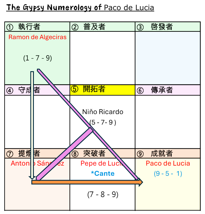 再者,因為5號「開拓者」的Niňo Ricardo與Paco的父親Antonio及長兄的Ramón de Algeciras都有密切的關係,形成在生命密碼的1-5-7的連結,故此也對Paco有直接影響,形成了另外一條生命密碼的1-5-9之連結。大家可在下列「圖表8」的展示中,便可發覺5號「開拓者」Niňo Ricardo的角色,正是串連起Paco家人的Key Person和核心人物;故此對Paco早期的吉他音樂發展來說,更是十分重要的角色。