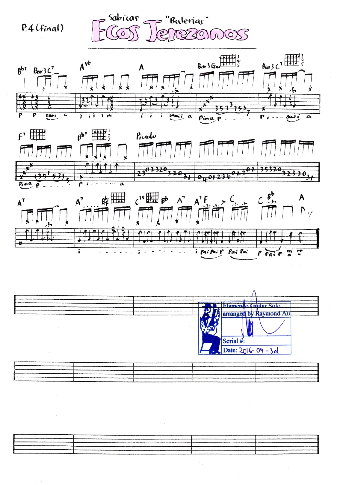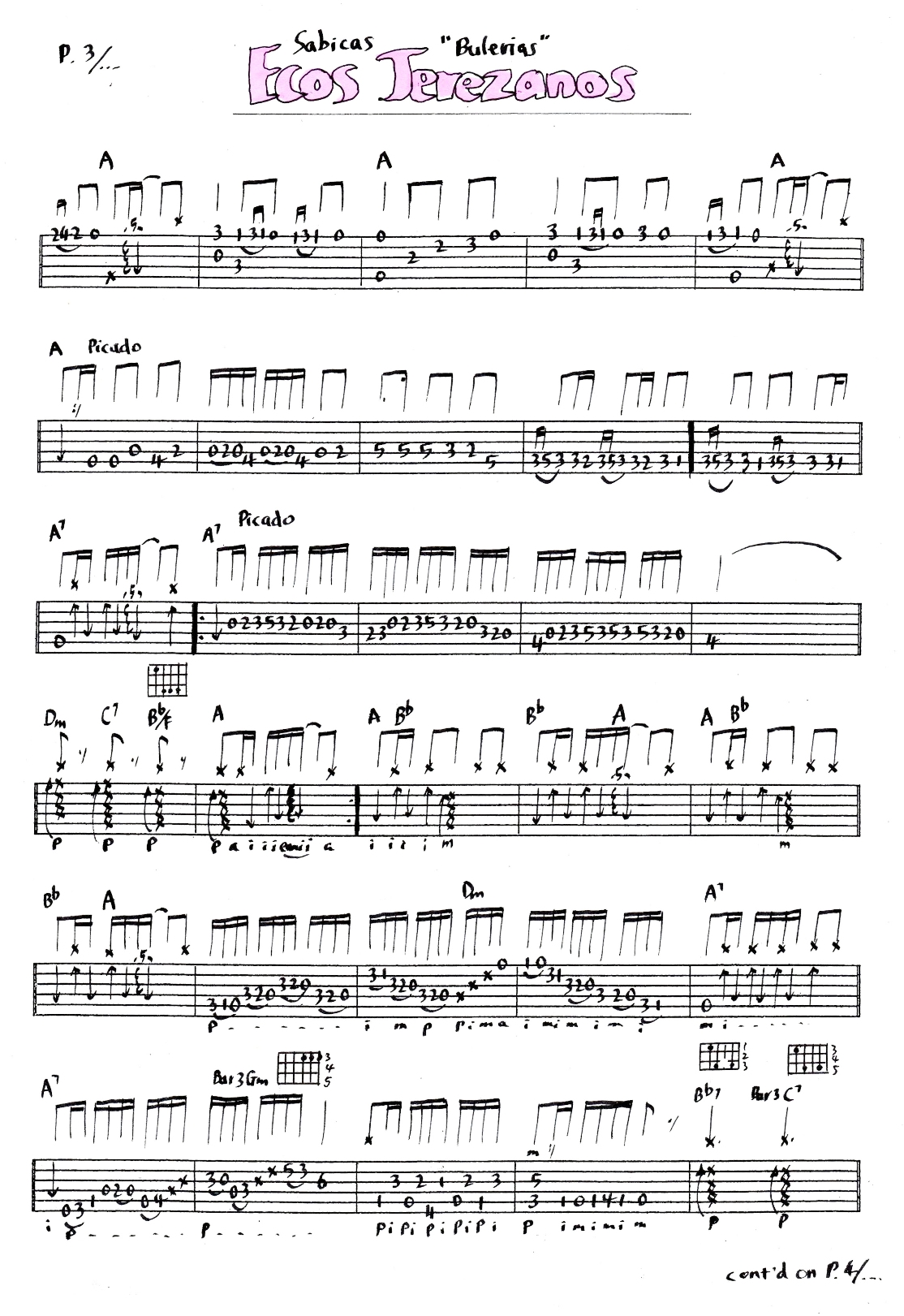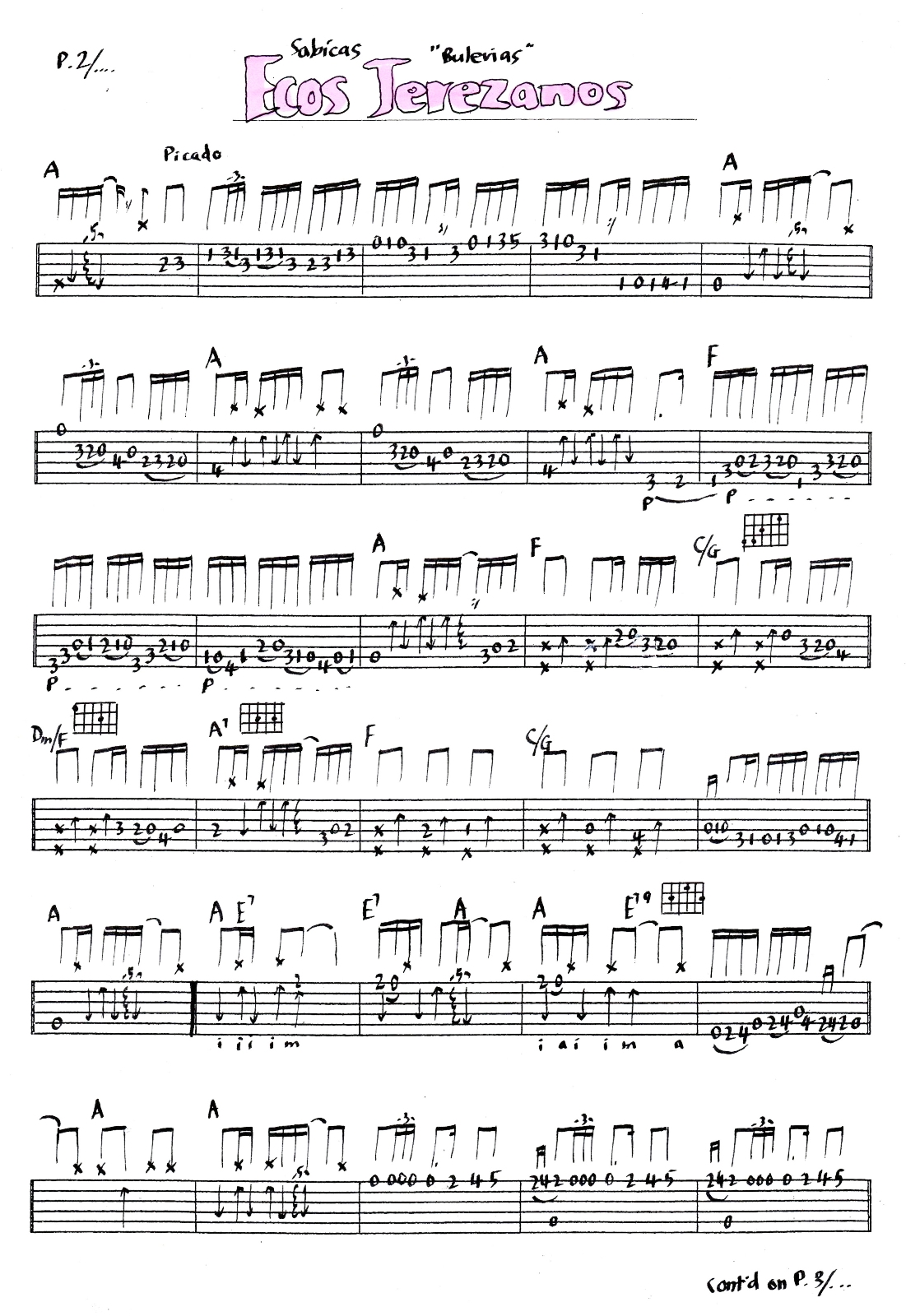 Sabicas在專輯中展現了Pulgar的連續Ligado和Alzapua技巧,速度快、音色清晰,並且節奏精準。為了讓大家更了解其音樂風格,筆者提供Ecos Jerezanos的手寫六線譜供學習參考。努力!