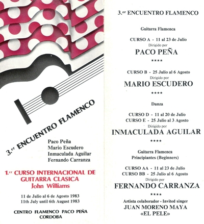 1982年中,筆者透過函授課程學習Flamenco結他時,當時在英國的老師Ray Mitchell先生建議我參加Paco Peña在西班牙科爾多瓦(Cordoba)舉辦的「第三屆Centro Flamenco結他國際研習班」,來提升自己對這門藝術的整體認識與水平。於是,我根據老師提供的資訊,直接寫信詢問Paco Peña有關報名的詳細內容。隨後筆者收到Paco的回信有關「第三屆Centro Flamenco結他國際研習班」的詳細介紹,和附上下面的課程單張作參考: