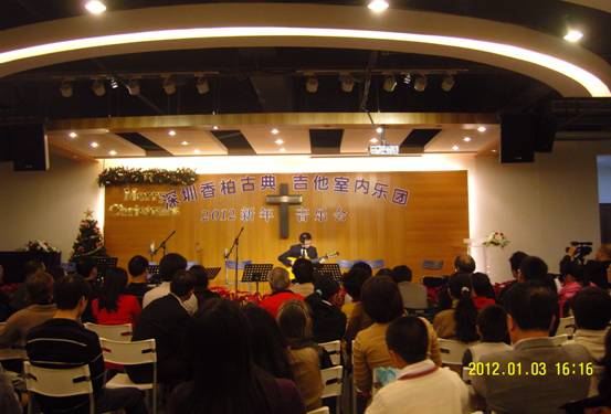 最后,我祝愿弗拉门戈吉他艺术,能够在深圳乃至中国慢慢滋长起来。顺便附上最近在深圳的演出活动照片给大家汇报。在香柏吉他室内乐团的新年音乐会上,我为张万里先生伴奏一首歌:莫斯科有我的爱,中间有添加弗拉门戈吉他的手法来増加气氛,效果也不错。