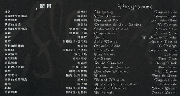 而筆者則相應地用不同的技巧來配合Adrian的創作,如追噫嘆息時的pulgar和ligado、送別時的無和絃的single rasgueado伴奏(仿效吉卜賽人送殯時Playeras的形式)、堅強奮發時的rolling rasgueado等。