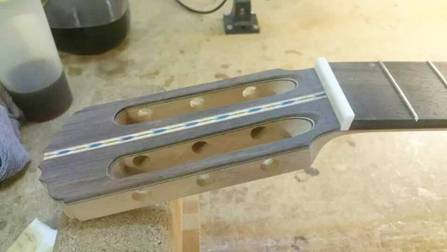 最後一周(10月12日 - 16日),大家的琴都陸續完成,調整指板後釘品絲修柄、打磨,然後蟲膠封閉後就裝配完成,而我是第一個最早完成的。