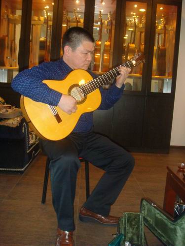 (春伟与忠华在试弹Alberto Cuellar先生的吉他)