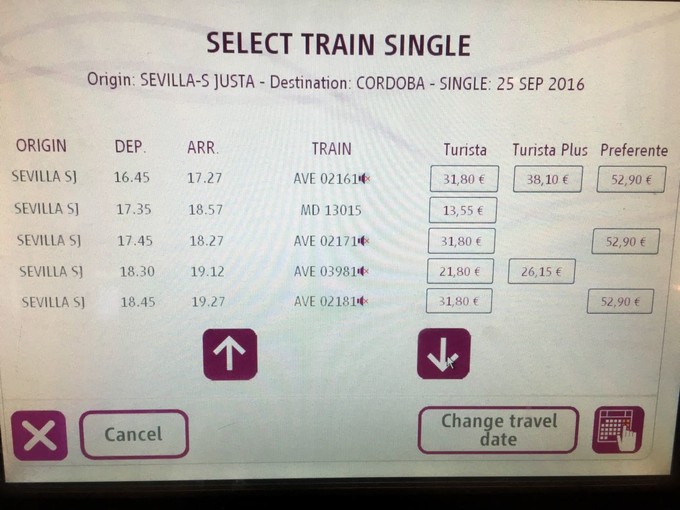 4. Madrid-Córdoba-Sevilla系西班牙高鐵Renfe AVE同一條路線上的三個站,如果從Madrid出發,會先經過Córdoba,再到Sevilla。但從城市的文化特點上,我覺得應該先去Sevilla。而且從Sevilla去Córdoba都系40分鐘,每日都有好多班車,可以到火車站先買票,用信用卡到Renfe的自動售票機買票好方便。這也是我行程中最隨意的一趟火車~