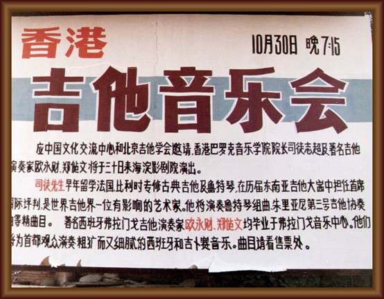 1986年10月底,筆者與鄭健文獲「中國國際文化交流中心」及「中國北京吉他學會」邀請,代表香港赴京進行維期一周的文化交流演出及講學活動,主要目的是推廣吾師Paco Peña的西班牙正統弗拉門戈吉他音樂藝術。這次的交流活動,我們共演出了三場音樂會,包括一場在「海淀影劇院」和兩場在新建成的「北京音樂廳」舉行;而我們當時也是歷史上首批獲准在音樂廳演出的Flamenco吉他手呢!Ole!