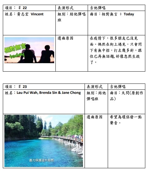 另外,筆者根據Angela提交有關這次報名參加《Zoom樂飄飄線上音樂會》會員的歌曲資料後,再編輯了一份節目表供讀者們先睹為快,總共有23個項目,詳情請參考附上的PDF文件。